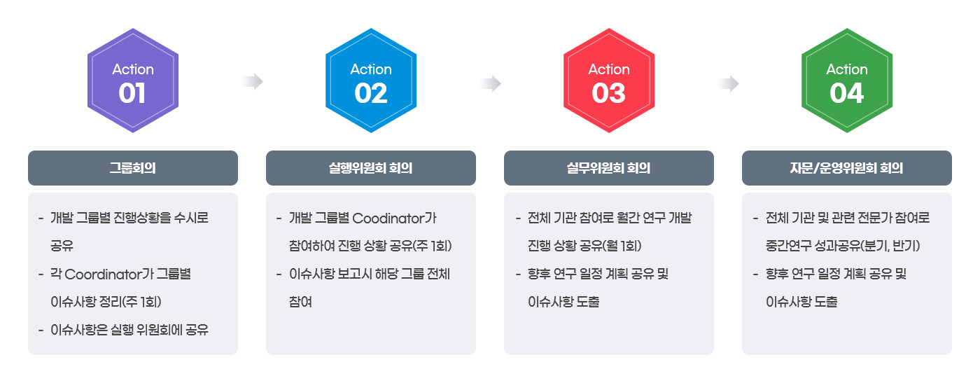 - 그룹/실행위원회/실무위원회.자문 및 운영 위원회를 통해 연구 진행 사항에 대해서 조율 및 합의